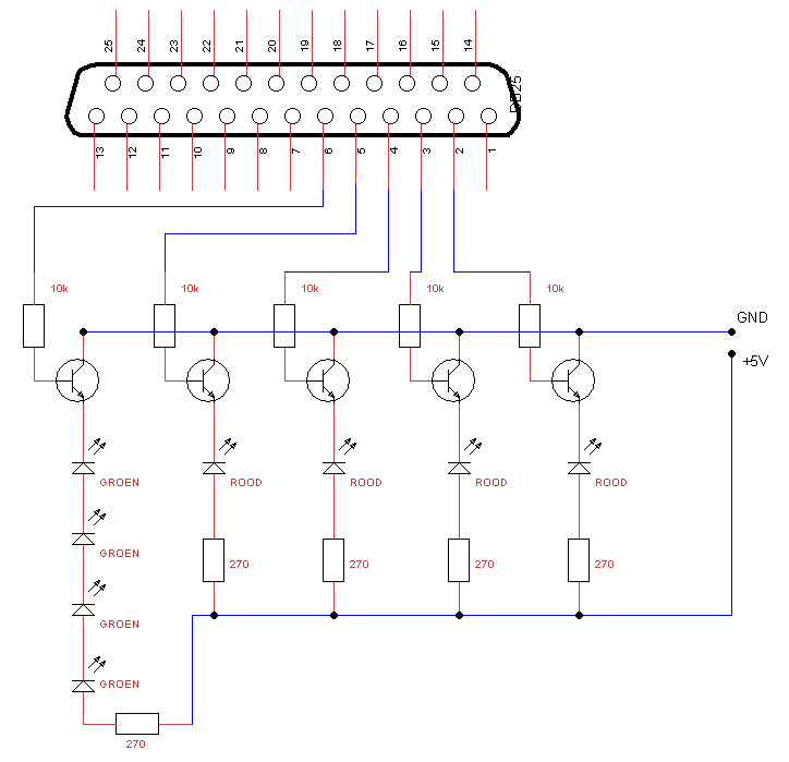 In Slotman kan eenvoudig bepaald worden hoe de verlichting aangestuurd wordt. Op de afbeelding hiernaast is te zien dat niet alle pinnetjes van de LPT poort gebruikt kunnen/mogen worden. Door eenvoudig op een rondje te klikken kan de status verandert worden. Er is de mogelijkheid om 5 pinnetjes te gebruiken voor de verlichten. Er gebruik er 4 om een voor een de rode LED's te laten branden en 1 om de groene LED's, die in serie staan, te laten branden. | ![]() |