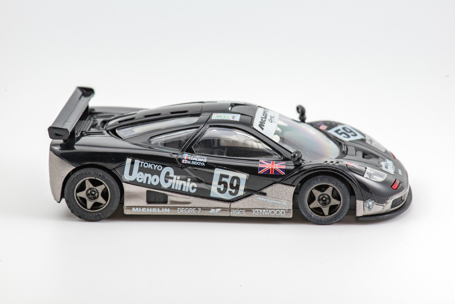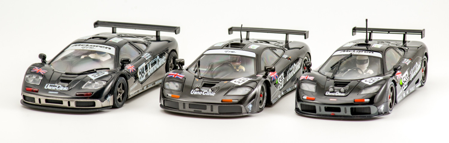 Hierboven de drie varianten van de winnaar van de 24h Le Mans 1995, ofwel de McLaren F1 GTR Ueno Clinic. Op dit moment is deze slotcar uitgebracht door Ninco (links) , Mr Slotcar (midden) en Scalextric (rechts).